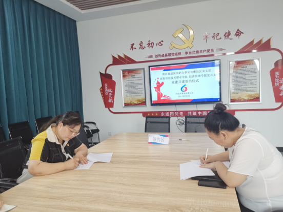 2021年7月2日上午,河南应用技术职业学院精选反差婊女神在线党总支与郑州高新区沟赵办事处秋雅社区党支部在秋雅社区党群服务中心举行党建共建签约仪式。