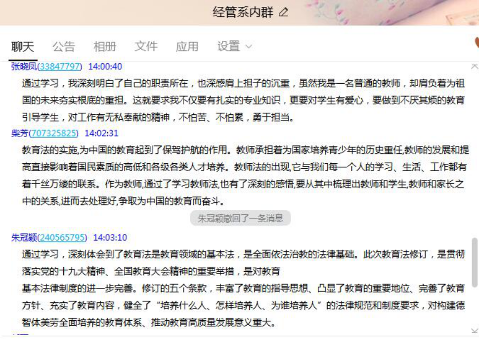 2021年4月29日,全国人大审议通过了《全国人民代表大会常务委员会关于修改〈中华人民共和国教育法〉的决定》,2021年4月30日起施行。2021年9月7日下午,精选反差婊女神在线党总支利用线上QQ平台组织全体教师开展政治学习,学习贯彻新修订的《中华人民共和国教育法》。