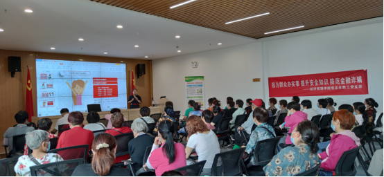 在活动现场,摆放着以漫画和案例为主的金融理财知识海报,灵动的展示了“理财有智慧,添财有态度”和“远离理财陷阱,共守家庭财富”内容,吸引了不少社区居民驻足观看。教工党支部柴芳芳老师进行了“投资理财知识宣传”公益讲座,向社区居民详细讲解了投资理财的实用性知识、理财的原则与内容和市面上主流理财工具。