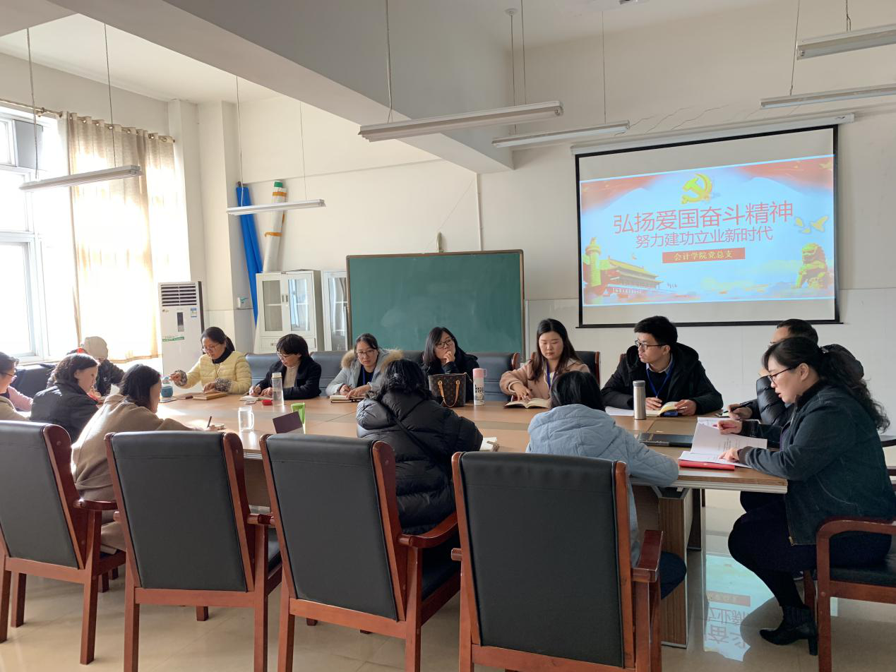 随后,会计学院教职工集体学习了党委下发的《关于在全校深入开展“弘扬爱国奋斗精神建功立业新时代”活动的实施方案》及《河南应用技术职业学院哲学社会科学报告会、研讨会、讲座、论坛管理办法》的通知。全体教职工纷纷表示要积极参加各项活动在新时代自觉弘扬践行爱国奋斗精神,不忘初心、牢记使命。除此之外进一步规范了相关活动管理行为,维护学校正常的教学秩序和活动秩序,保障学生合法权益。会计学院教师通过学习交流,把握学院管理办法的新理念、新内涵、新要求。