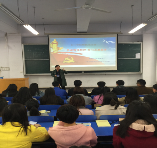 2016年11月1日,为进一步加强“两学一做”系列教育活动的深入开展,营造“两学一做”学习教育的浓厚氛围,弘扬会计学院特色学生党支部“传承雷锋精神 参与志愿服务”精神,会计学院党总支书记李兆楠同志带领全院1名学生党员73名入党积极分子在B201教室进行入党积极分子教育,并对“两学一做”学习教育开展以来学生党员及入党积极分子学习情况进行检查。