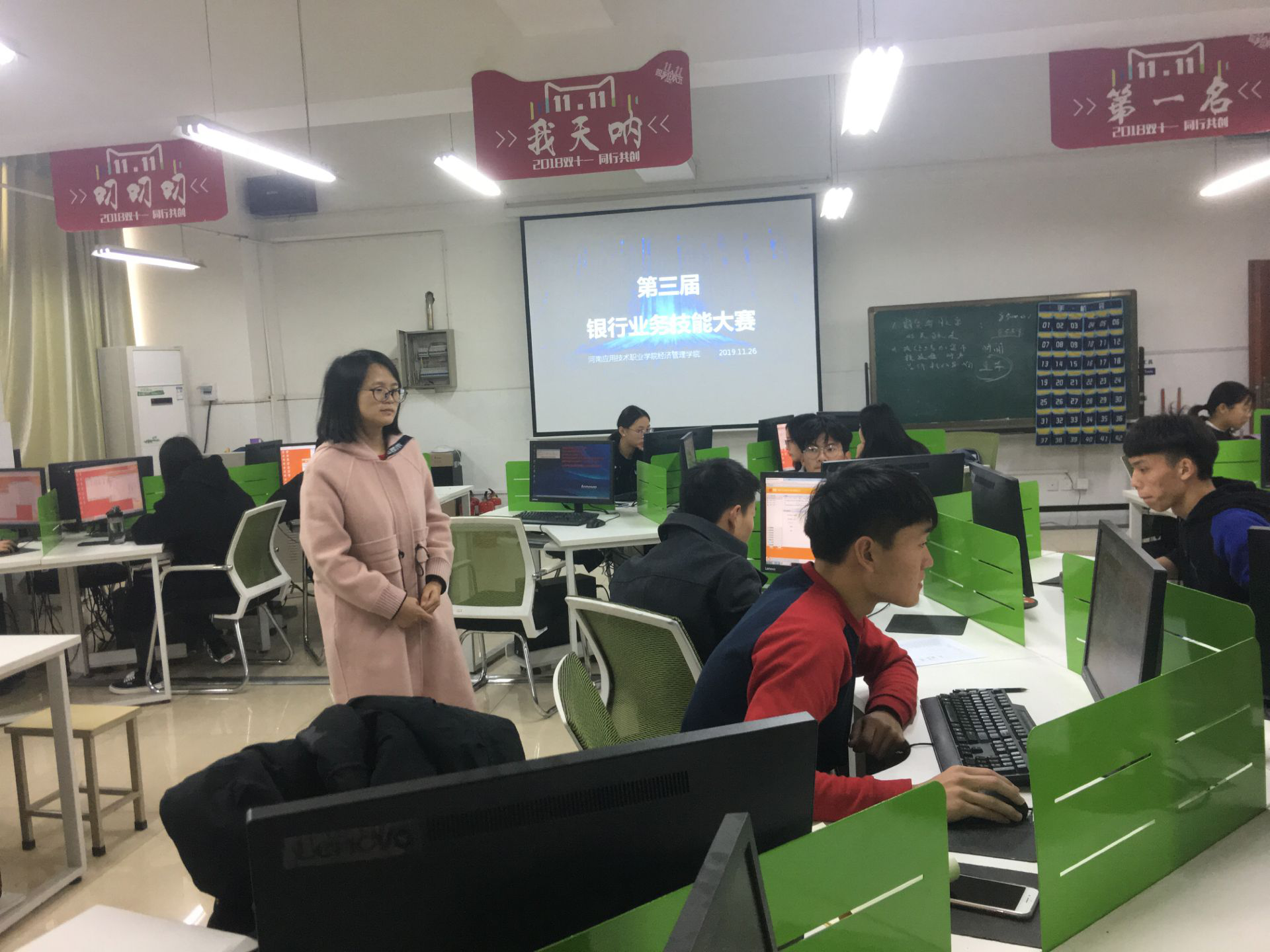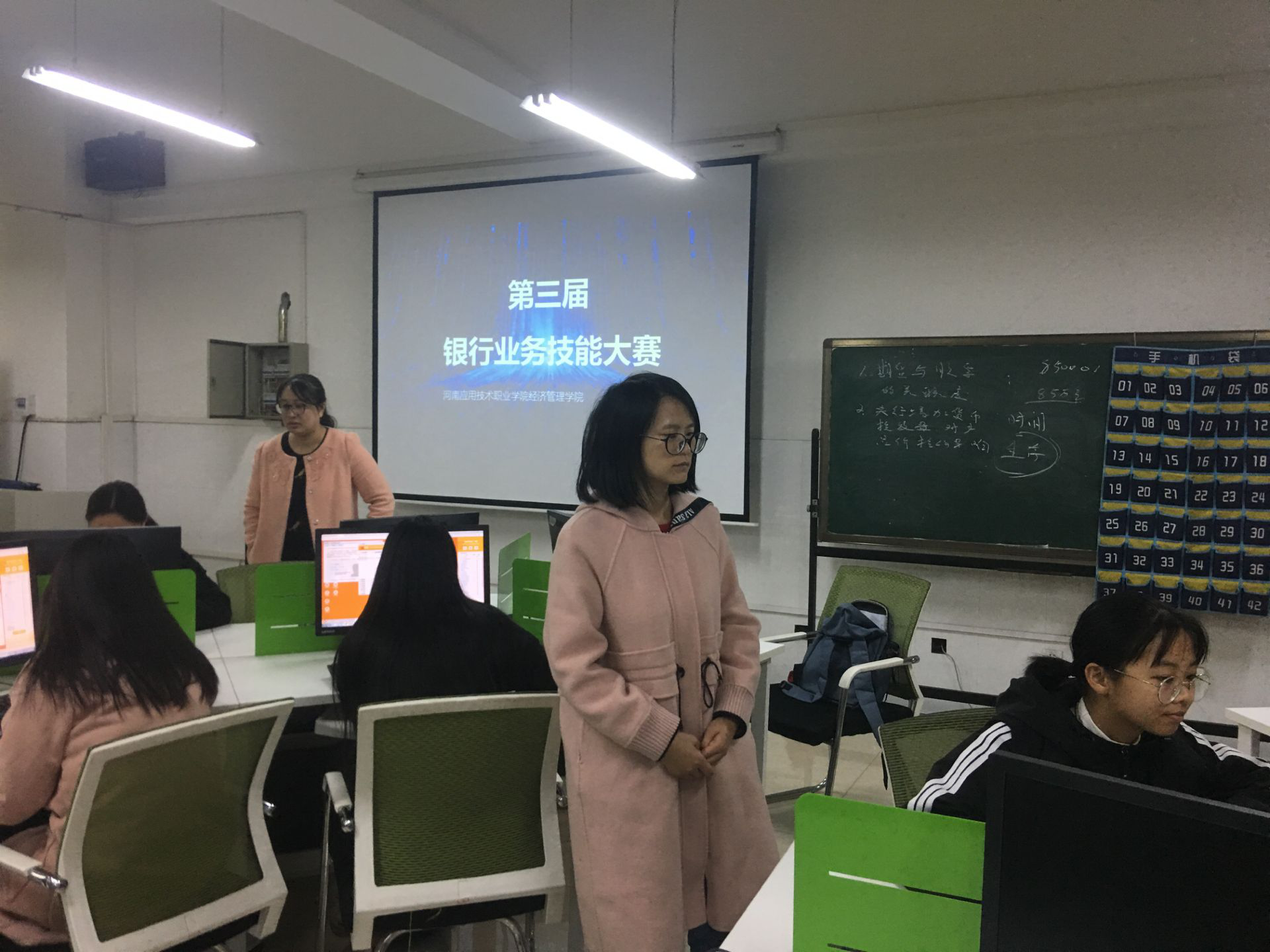 2019年12月03日下午,由河南应用技术职业学院主办精选反差婊女神在线承办的第三届“银行技能大赛”圆满落幕。本次大赛在学校大力支持和精选反差婊女神在线张召哲院长的指导下,由赵静、凌端平两位老师指导,在金融实训室E617如期举行。本次技能竞赛既是对学生金融知识和技能的考验,也是对金融专业教学成果的检验,旨在通过院内比赛,为今后参加校外技能大赛总结经验,达到“以赛促学、以赛促训、以赛促赛”的目的,以期更好地推进专业建设、提升课程教学效果。?