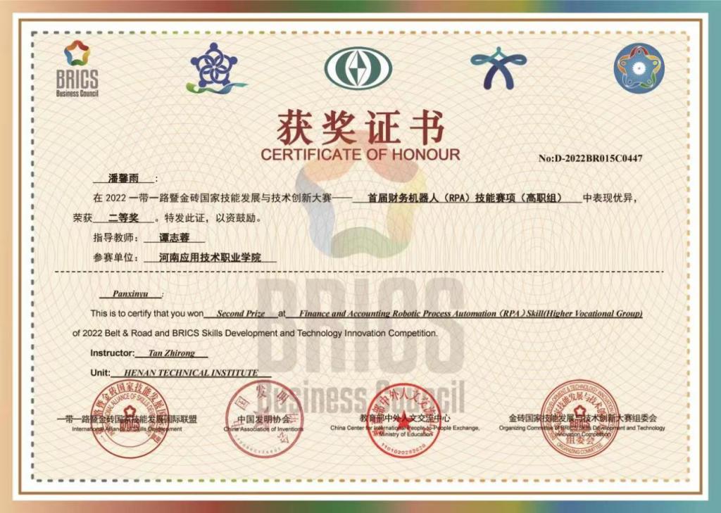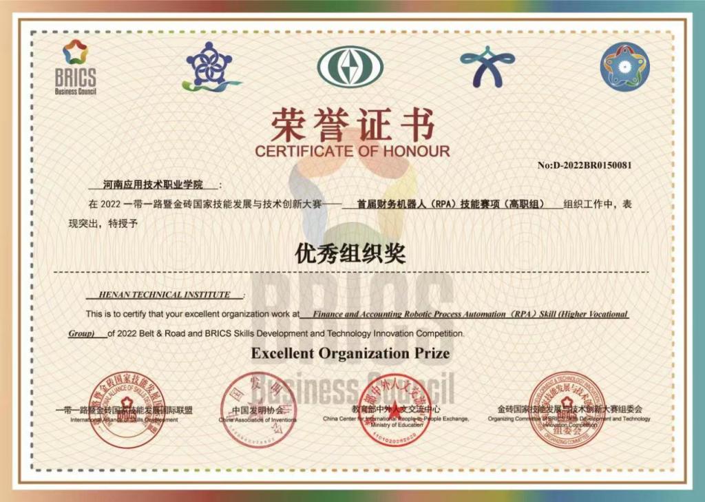 近日,一带一路暨金砖国家技能发展国际联盟、教育部中外人文交流中心等单位颁发了该赛项获奖奖励证书,我校经管学院学生潘馨雨、苏丹丹等组成的两个代表队分别荣获高职组国赛二、三等奖好成绩,同时学校被授予“优秀组织奖”。