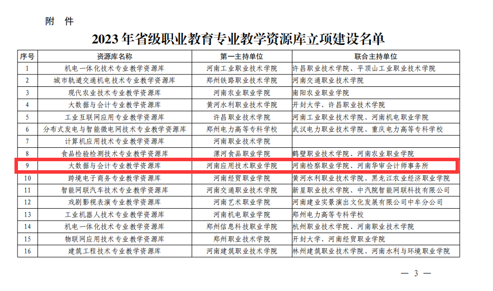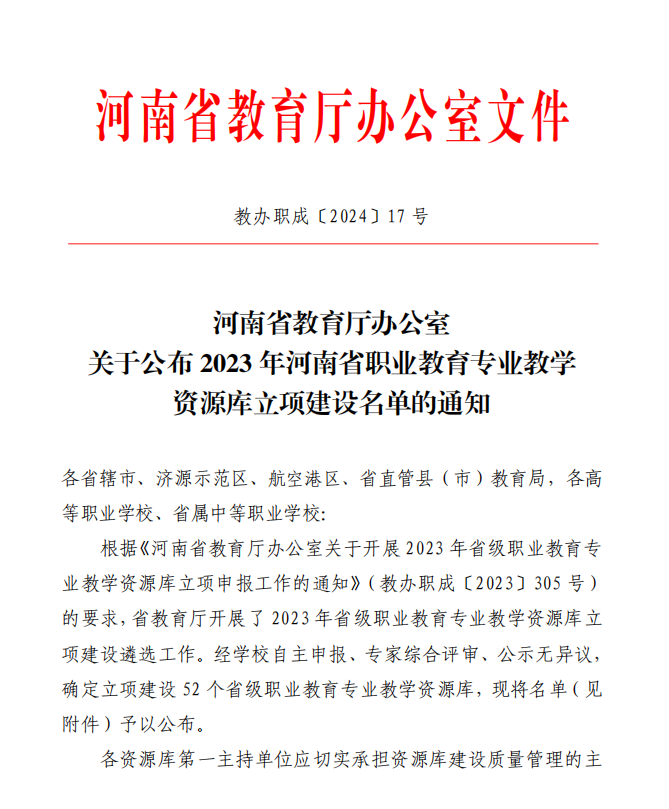近日,河南省教育厅下发了《河南省教育厅办公室关于公布2023年河南省职业教育专业教学资源库立项建设名单的通知》(教办职成〔2024〕17号),我校主持的大数据与会计专业教学资源库获批立项建设项目。