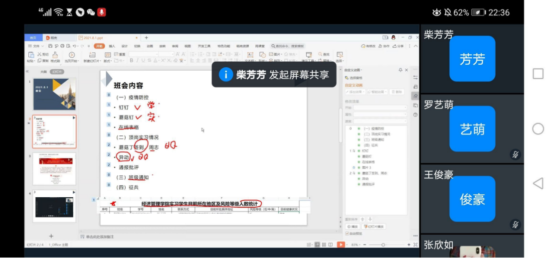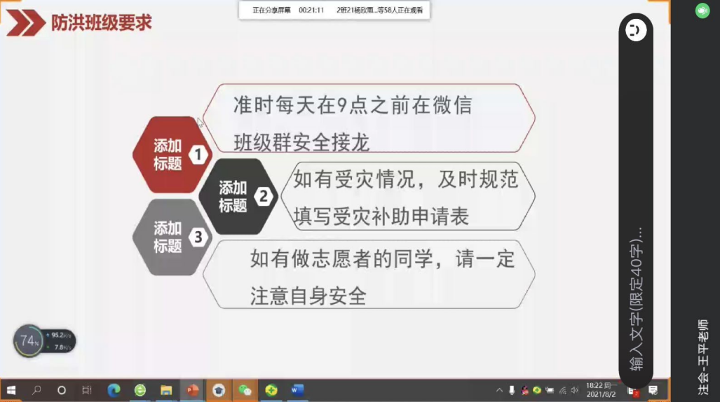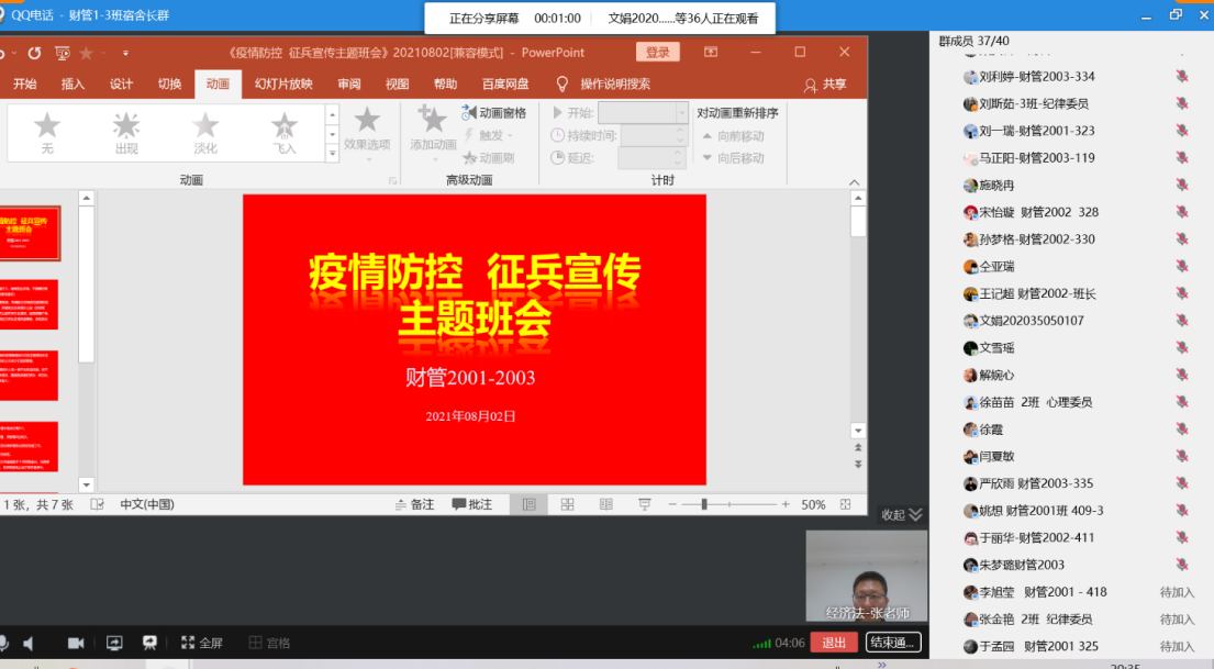 线上班会结束后,学生纷纷表示激发了大学生参军入伍热情,“合理规划,不负韶华”;面对疫情要做到“科学认知,坚定信心, 做好防护,坚持打卡”,以精神饱满的姿态迎接新学期的到来。
