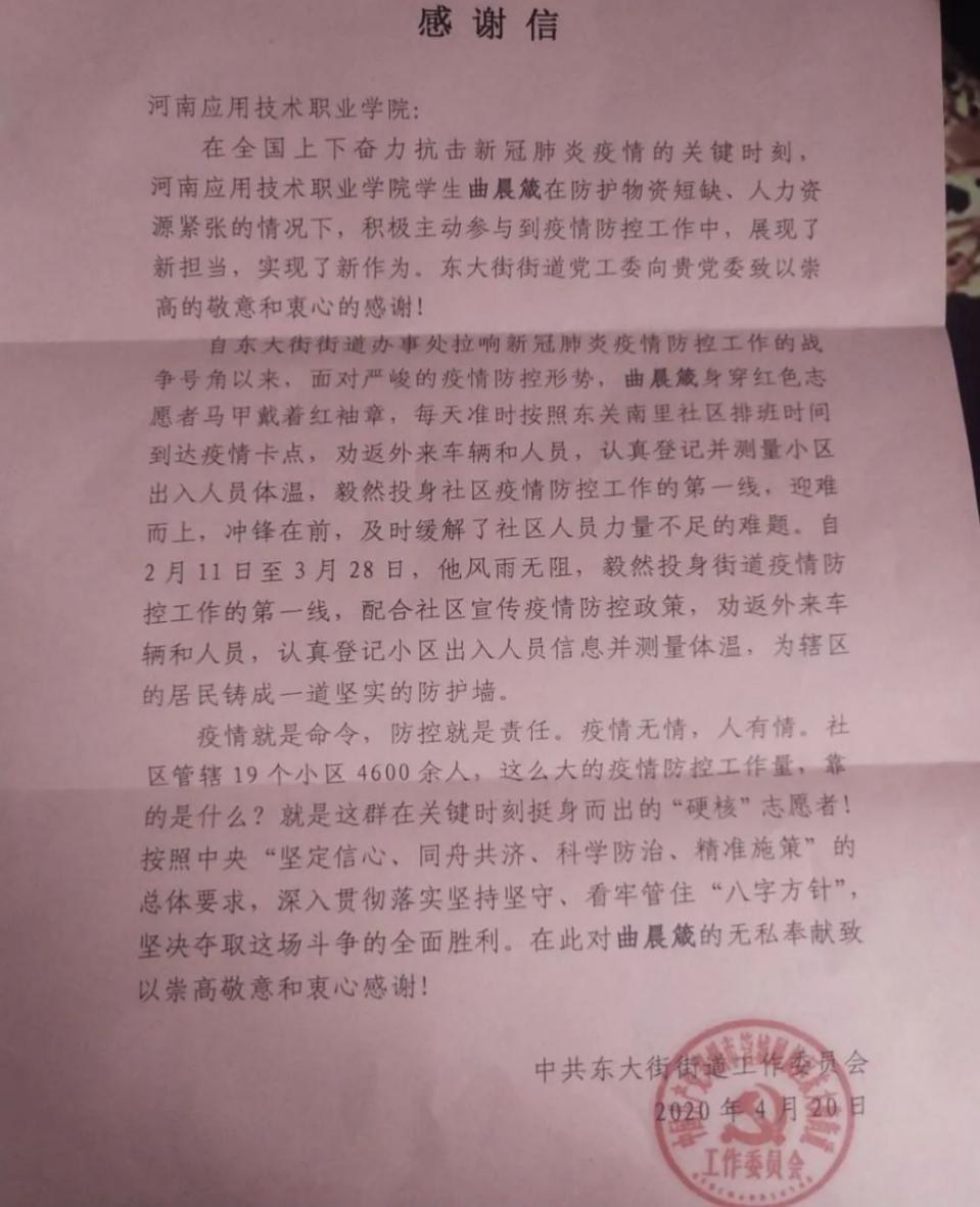 世上没有从天而降的英雄,只有挺身而出的凡人。“病毒无情人有情,疫情面前显担当”。这场“战役”中,涌现出了大量的青年志愿者,用自己的方式展担当、逆流而上、冲锋在前。近日,我院收到来自郑州市东大街街道工作委员会的感谢信。信中提到,我院会计1703班曲晨箴以志愿者的身份闪耀在疫情防控工作中,彰显了当代青年的勇气与担当。在这温暖的春日里,他和全国千千万万的志愿者们一起发挥雷锋精神,力争早日打赢战疫。