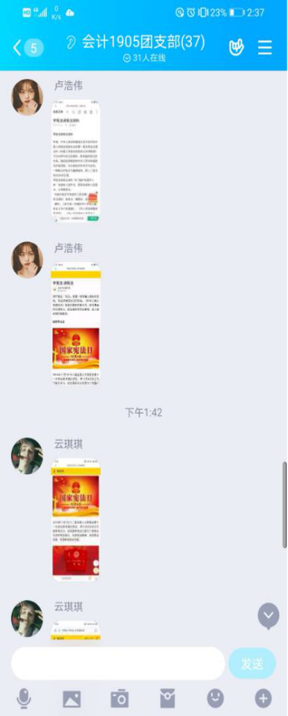 一、学习宪法知识,提高宪法意识,做一个知法、守法、遵法、用法的当代大学生。各团支部前期积极筹备团课材料,以不同的形式开展此次团课,其中,会计1903团支部由团支书马如意为大家简单介绍了:“中华人民共和国宪法是中华人民共和国全国人民代表大会制定和颁布的国家根本大法,规定国家的根本制度和根本任务,公民的基本权利和义务,国家机构的组织原则和职权。宪法具有最高的法律效力,一切法律、法规都必须依据宪法,都不得同宪法相抵触。”然后播放了一个视频给大家深入介绍了宪法的内容以及作用。期间,同学们表现积极,认真观看了视频,反响良好。注会1902班团支部组织团体学生积极学习新中国宪法的发展历程、宪法的意义、宪法的作用等有关宪法的知识。“宪法是我国的根本法,是治国安邦的总章程”。宪法在根本上和宏观上确定着控制国家权力的基本原则、基本制度和基本方法。而宪法确定这些基本原则、基本制度和基本方法的最高价值是维护人的尊严,可以说,宪法所确定的基本原则、基本制度和基本方法都是围绕着如何更好地维护人的尊严而展开的。一切国家权力均来源于宪法并受制于宪法,宪法不仅控制着整个国家权力,而且国家权力之组成部分的立法权、行政权和司法权的运行和展开,均需遵从宪法的最高知法,守法是青年学生健康成长的需要,不仅要学习宪法知识,提高宪法意识,更要做一个知法、守法、遵法、用法的新时代大学生。