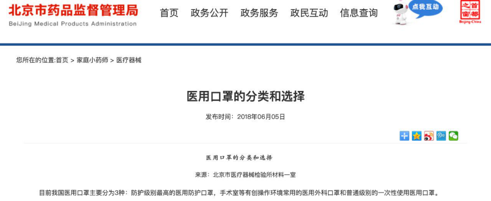 根据北京市药品监督管理局刊登的文章显示,医用口罩目前分为三种类型:医用防护口罩、医用外科口罩、普通医用口罩(医用护理口罩)。北京市医疗器械检验所材料一室发布的文章显示: