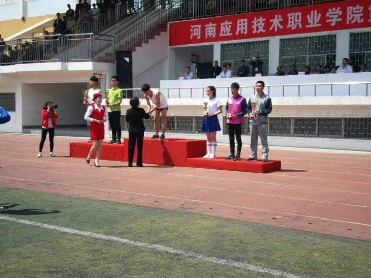 上午8时30分,运动会正式拉开帷幕。仪式进行第一项,运动会开幕式。走在前面的是我校国旗队紧随其后的是我院7大方块队。菁华如风 ,气势如虹, 会计学子, 立定苍穹。听,那激昂嘹亮的口号,会计学院的学子迈着矫捷的步伐向我们走来。这是一个团结进取,努力拼搏,富有青春活力的代表队。她们英姿飒爽,活力四射的在向大家表白:让我们同欢乐!同追求!同拼搏!共同谱写学院辉煌的篇章。仪式进行第二项。由我院校长姚勇致辞:体育无处不在,运动无限精彩。一直一来我校一直响应“每天运动一小时,健康生活一辈子”的阳光体育运动理念。希望大家在此次运动会上赛出风格,赛出水平。仪式进行第三项由我校党委书记郭改英宣布河南应用技术职业学院第二届春季运动会正式开始。枪声响起,女子1500米预赛开始。起跑瞬间会计学院的选手赵宣宣像风一样奔驰在赛道上,向着终点,奋力一搏,努力为学院、为班级争光。观众台上大家的加油声鼓声一波又波。加油!胜利就在前方。田赛项目也随之拉开帷幕,男子跳高中,会计学院的王海旭选手奋力一跃,轻松过杆。大家的掌声欢呼声响起一片。4X100m接力大家默契传递,你追我赶;毛毛虫趣味项目中大家密切合作齐头并进。经过大家为期两天的努力。会计学院在女子1500米,3000米径赛中选手赵宣宣荣获第一名,女子小跳绳比赛中鲁思琪荣获第三名;男子400米径赛中王海旭荣获第五名;男子跳高范伟荣获第四名;男子4X100接力第二名;男子足球打靶田赛中李帅旗荣获第二名;呼啦圈竞赛第二名。同时会计学院荣获全校三等奖的荣誉。