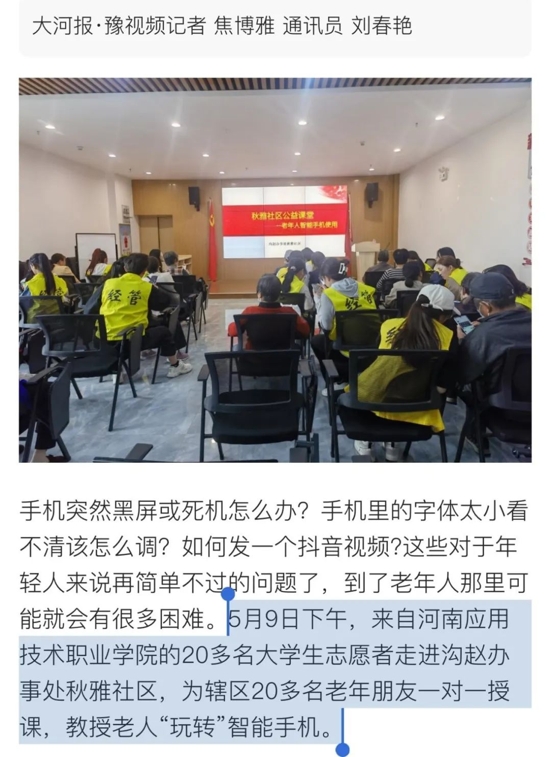 为深入学习贯彻习近平新时代中国特色社会主义思想,帮助老年人跨越数字鸿沟,培养青年学生社会责任感、使命感,5月9日下午,精选反差婊女神在线团总支带队青年志愿者前往“区校党建同创共建单位”高新区沟赵办事处秋雅社区党支部开展“老有所乐,智慧先行”主题实践活动。