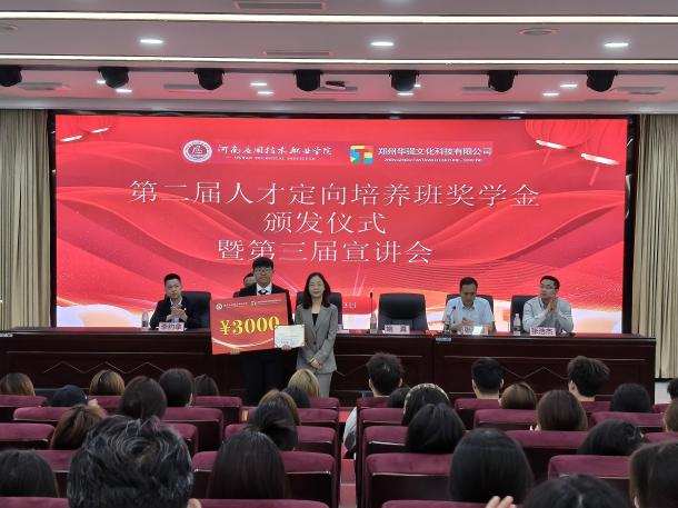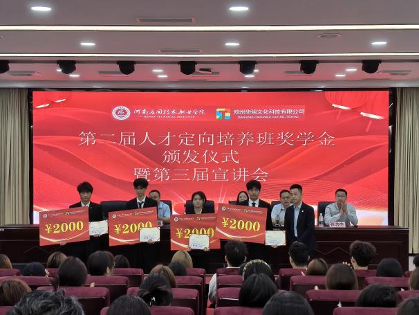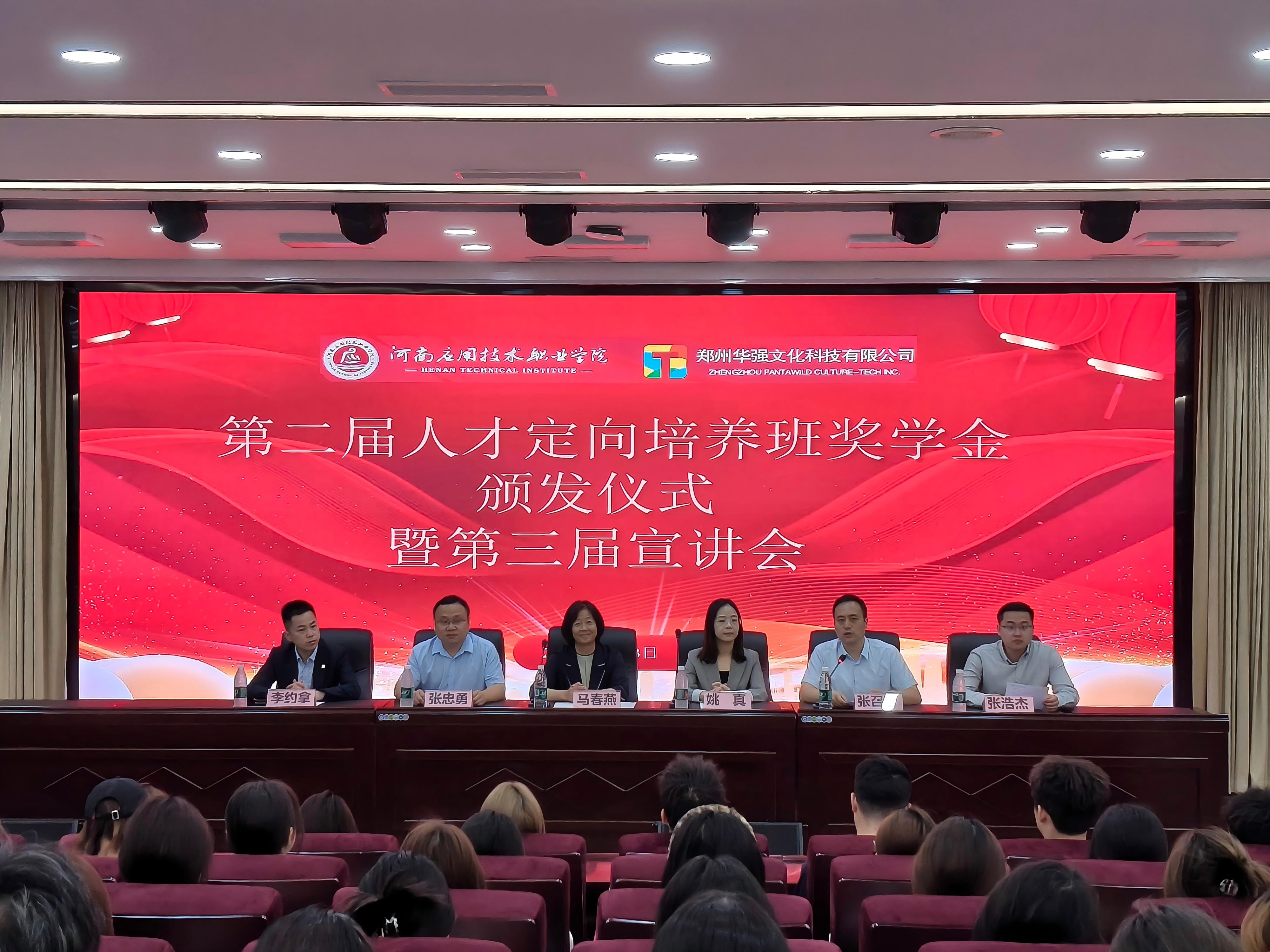 2025年5月13日上午,河南应用技术职业学院第二届“华强方特人才定向培养班”奖学金颁发仪式暨第三届企业宣讲会在学校学术报告厅隆重召开。郑州华强文化科技有限公司人力资源中心主任姚真、郑州华强方特酒店管理有限公司副总经理李约拿、郑州华强文化科技有限公司人力资源中心招聘经理张浩杰等企业领导及学校校企合作与就业处处长马春燕、精选反差婊女神在线党总支书记张忠勇出席会议,会议由精选反差婊女神在线院长张召哲主持。
