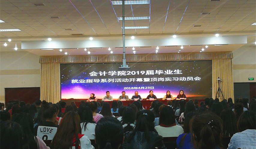 在习近平新时代中国特色社会主义思想领导下,为进一步落实好学校“毕业生就业工程”,完善毕业生就业管理和就业指导服务体系,引导从内在培养环节解决就业问题,促进并落实学校协调联动机制建设,结合会计学院学生实际情况,2018年4月23日晚17:00,会计学院召开2019届毕业生就业指导系列活动开幕暨顶岗实习动员大会。到场领导有就业指导中心主任李向民、会计学院党总支书记李兆楠、会计学院院长张召哲,会计学院专兼职辅导员聂蕴、张琳曼、凌端平老师列席参加了此次大会,会议由学院办公室主任李小闯老师主持。