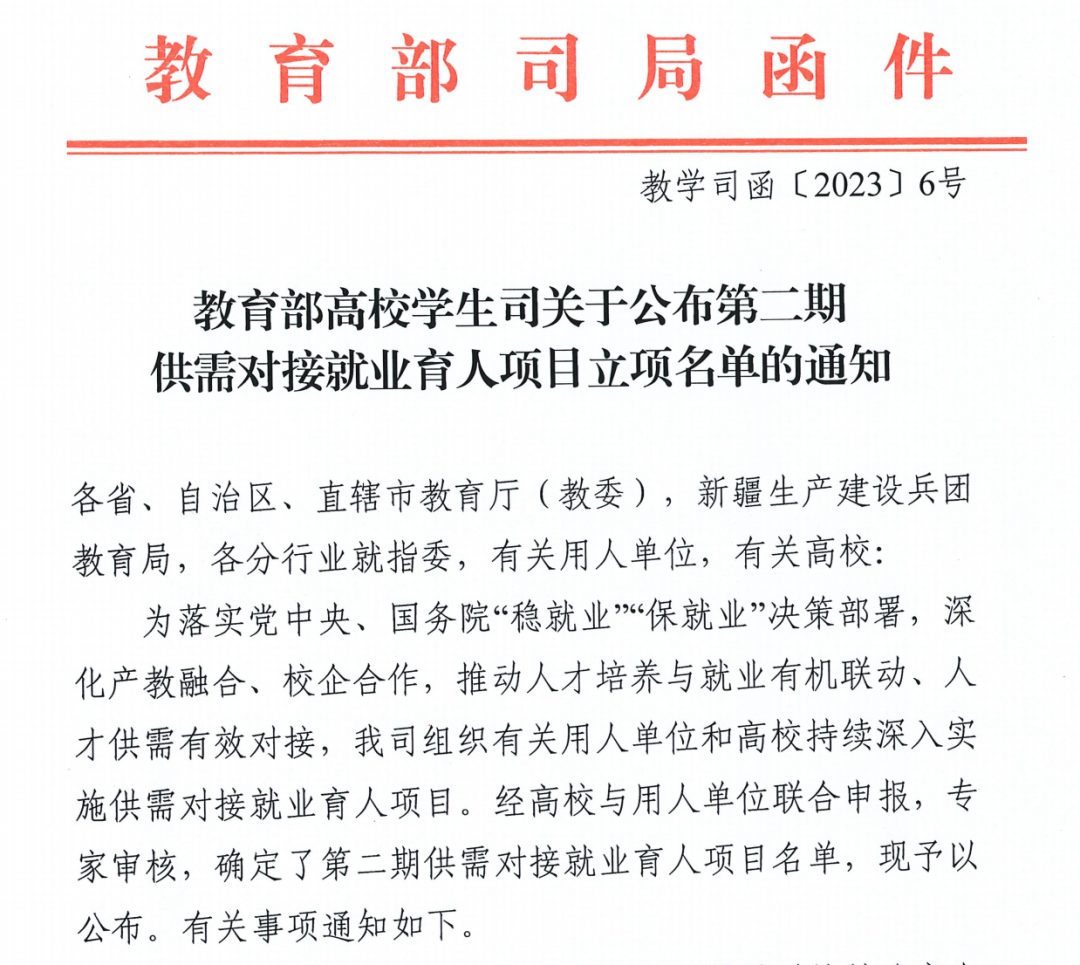 近日,教育部高校学生司印发了《关于公布第二期供需对接就业育人项目立项名单的通知》(教学司函〔2023〕6号),精选反差婊女神在线联合新道科技股份有限公司成功获批教育部第二期供需对接就业育人项目。