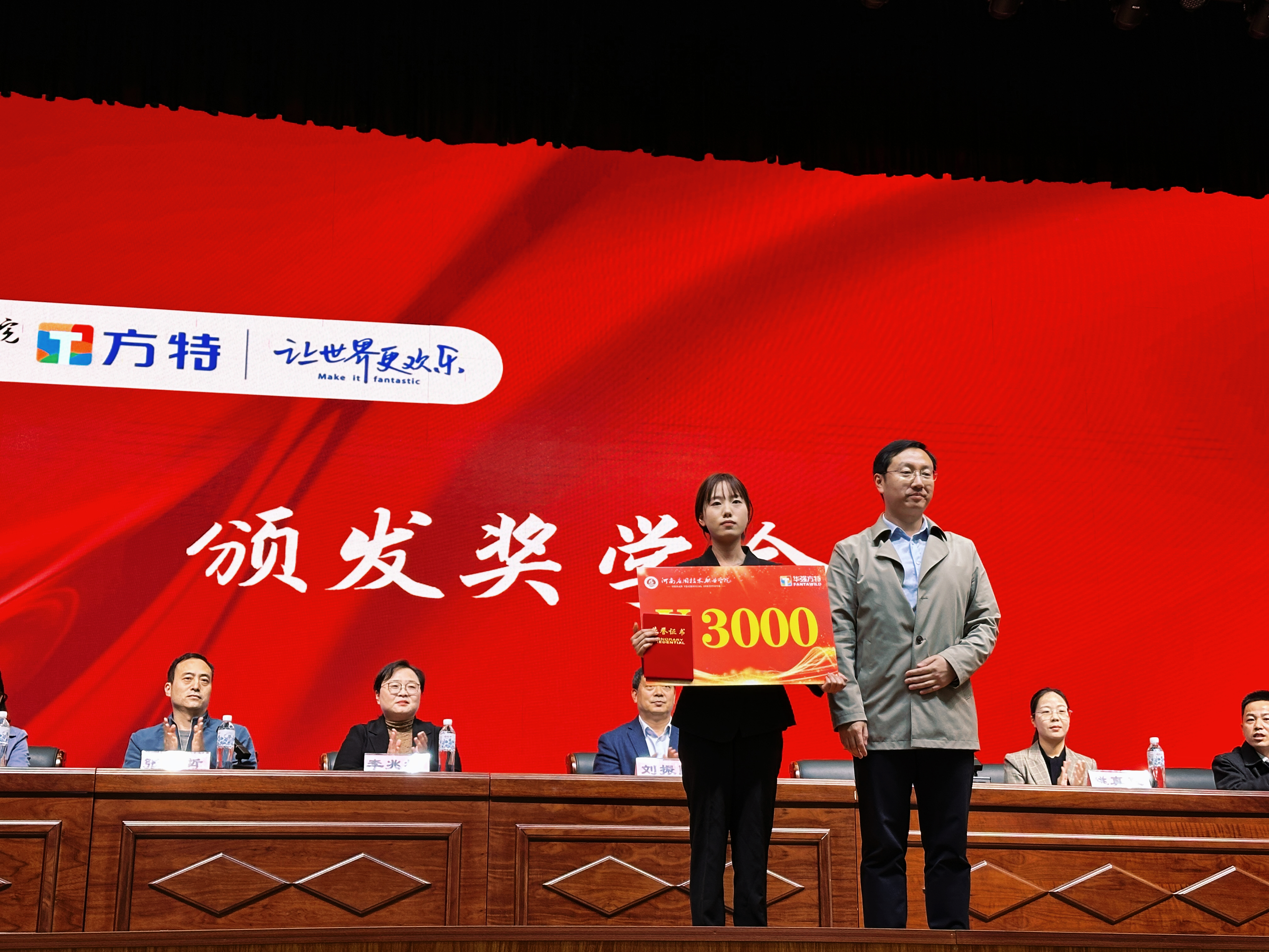 杨绍伟作为设奖单位致辞,对获得奖学金的同学表示祝贺并对大家在日常实践中的辛勤付出予以肯定。他表示企业设立奖学金的目的就是鼓励同学们发奋图强,勤学善思、踏实肯干,早日成为企业和社会需要的技能型人才。华强方特也将继续与学校深化合作交流,不断巩固和扩大合作成果,努力在更多领域实现互利共赢。