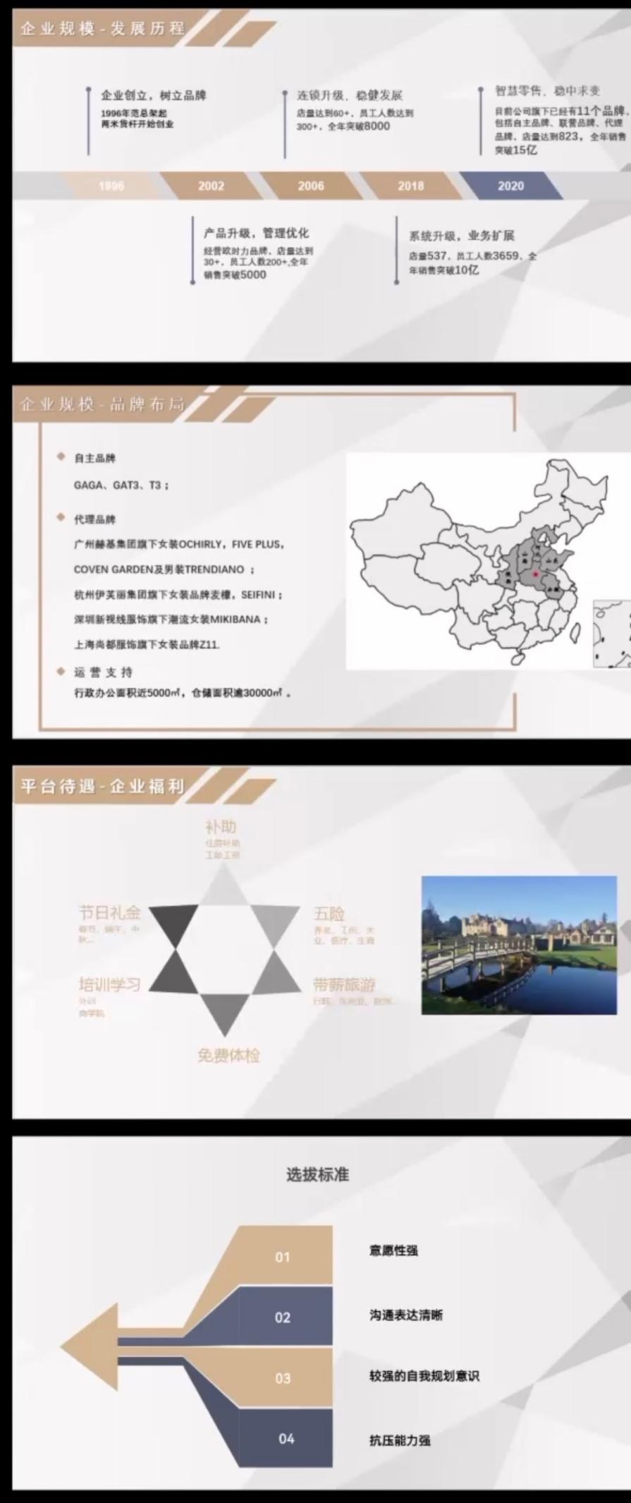 曹聪聪对巨木服饰的品牌布局、品牌形象、工作环境、薪资水平、企业福利、团队建设等内容进行介绍,指出本次招聘人才选拔标准是意愿性强、沟通表达清晰、自我规划意识、抗压能力强。欢迎同学前往巨木服饰进行实习。