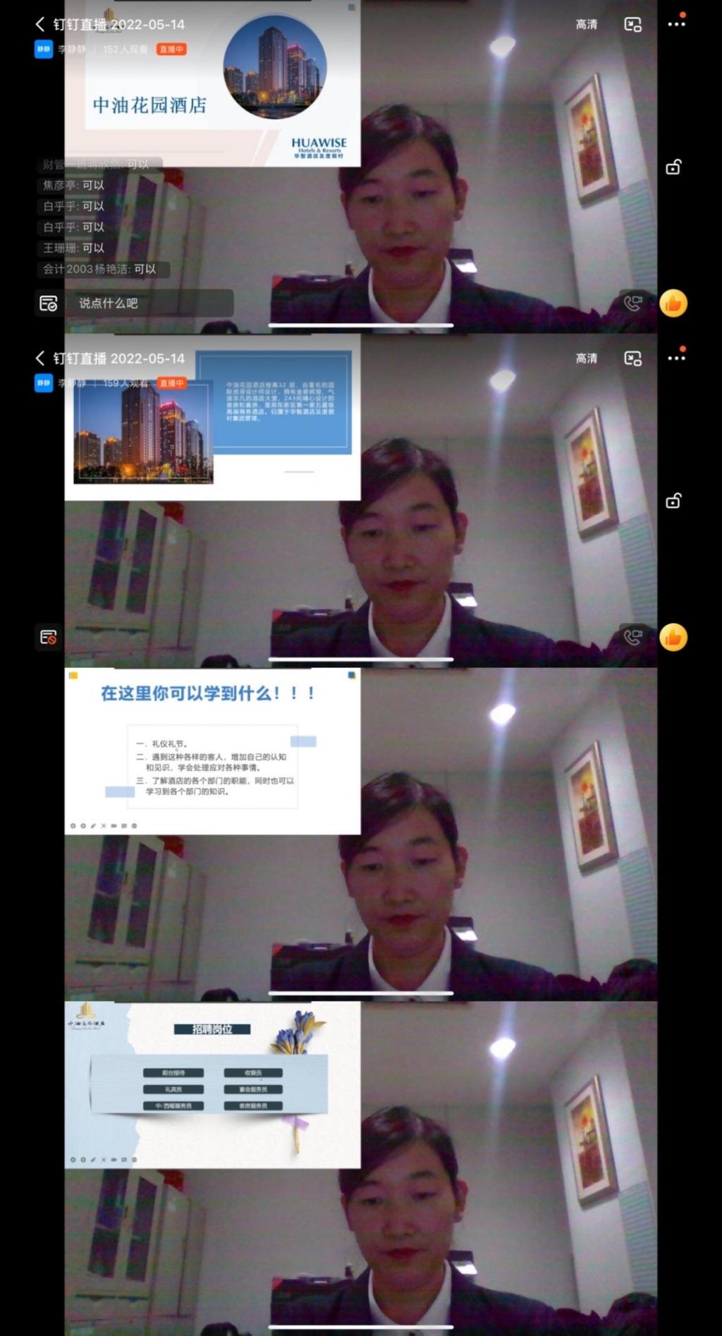 中油花园酒店位于郑东新区CBD,是一家按照国际标准配置,集会议、商务、度假为一体的星际酒店。李静静从衣食住行、晋升待遇、员工活动等方面介绍了实习条件,并指出在这里能学到礼仪礼节、部门联动等知识。本次需要招聘的岗位有前台接待、预定员、服务员、接待员、收银员等。