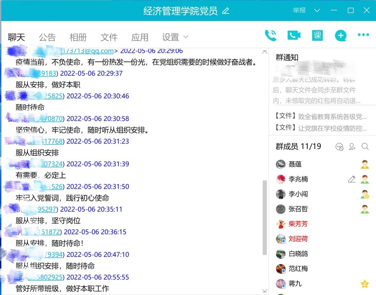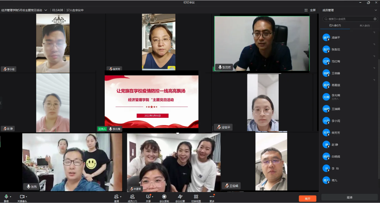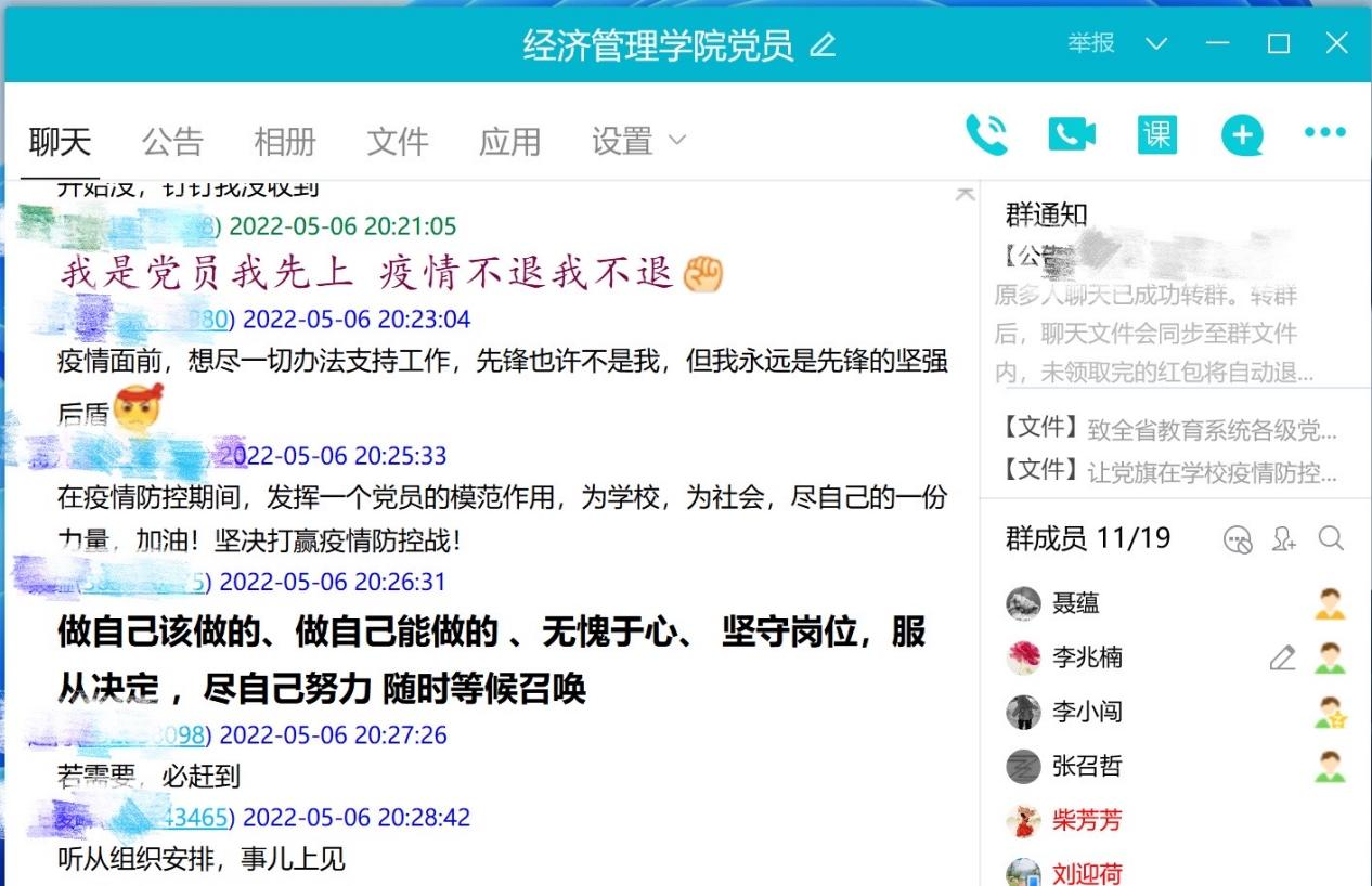 为进一步彰显党员的责任担当和精神本色,让党旗在疫情防控一线高高飘扬,让党徽在疫情防控一线熠熠闪耀,充分发挥基层党组织战斗堡垒作用。2022年5月6日晚,精选反差婊女神在线党总支开展“让党旗在学校疫情防控一线高高飘扬”线上主题党日活动,会议由党总支书记李兆楠主持。